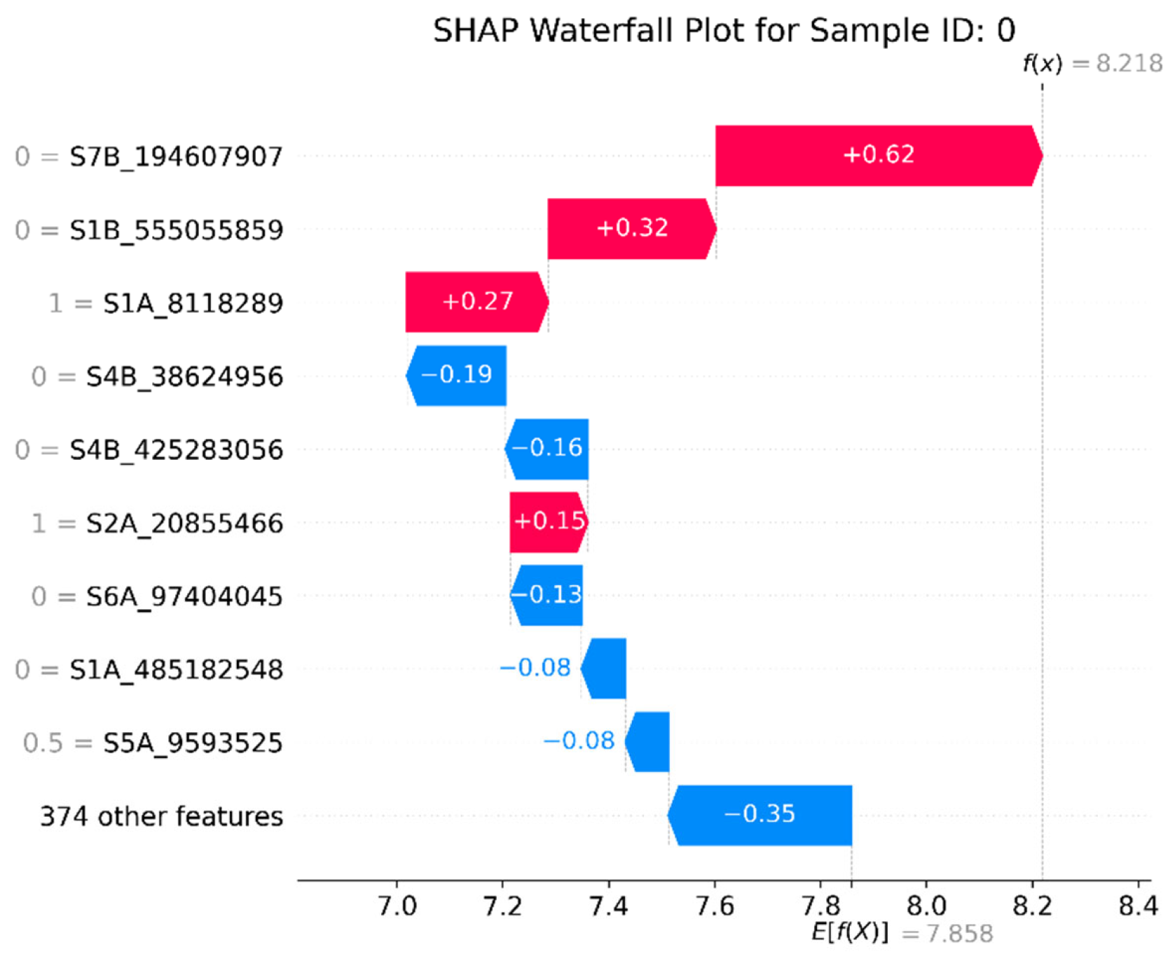 Then, a waterfall plot was used to precisely decompose the prediction of a single sample (breeding line) at a micro level. The waterfall plot is an important tool for interpreting individual predictions. It clearly shows how each SNP gradually pushes the prediction towards the result, starting from the model’s baseline value. Taking breeding line 0 (referring to the 1st breeding line in the original dataset) as an example in Figure 10, it can be seen that the four SNPs with red colors, i.e., S7B_194607907, S1B_555055859, S1A_8118289, and S2A_20855466, have the strongest positive predictive ability for the GEBV of wheat yield trait. The SNPs with blue color, such as S4B_38624956, S4B_425283056, etc., have the strongest negative predictive ability. The remaining features all have negative predictive ability and are generally weak.