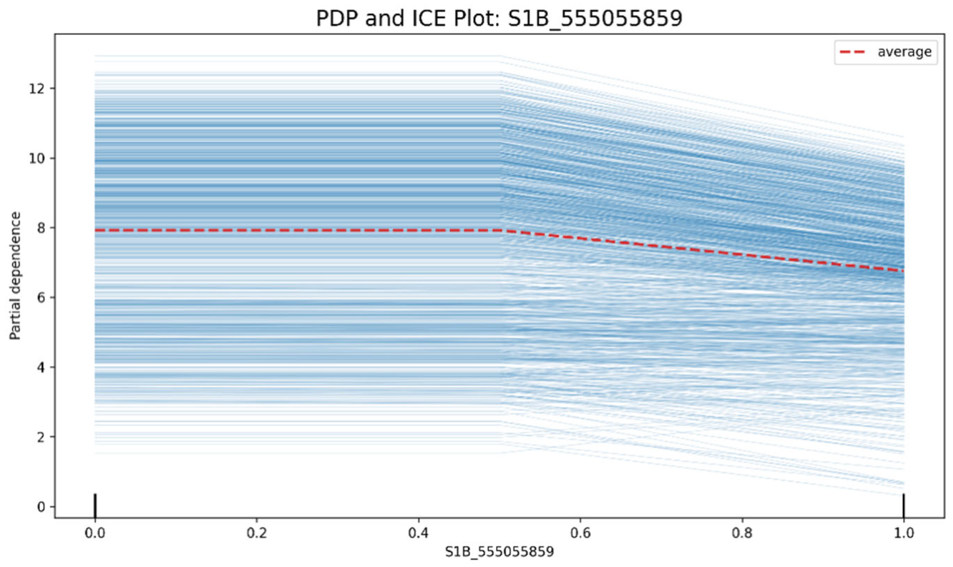 Figure 11. SHAP (PDP) and individual conditional expectation plot (ICE) of SNP S1B_555055859. The thick dashed red line is the PDP, and each thin line represents the ICE curve of a sample. This allows us to see whether there are significant differences in the impact of features on different samples (i.e., whether there are heterogeneous effects). If all the thin lines are roughly parallel, it indicates that the impact of the feature is relatively consistent; if the thin lines cross and are chaotic, it indicates a strong interaction effect.