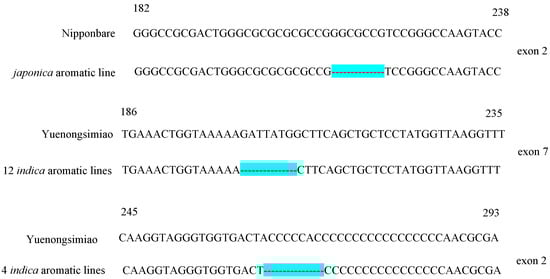 Mutation-type comparison of badh2 alleles in different aromatic lines and non-aromatic lines. The blue-bottomed horizontal line indicates different base deletion fragments: 7 bp (5′-GGCGCCG-3′) deletion in badh2-E2 of japonica aromatic lines, 8 bp (5′-GATTATGG-3′) deletion in badh2-E7 of 12 indica aromatic lines, and 8 bp (5′-ACCCCCAC-3′) deletion in badh2-E2 of 4 indica aromatic lines.