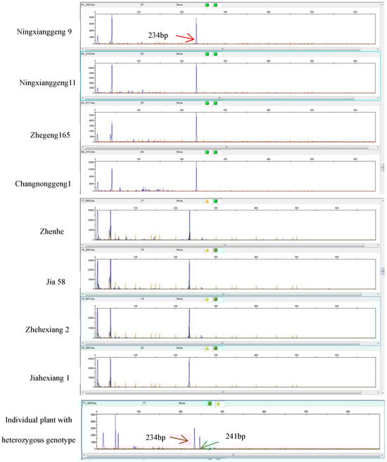 ABI 3730XL electrotraces showing multiplex-ready PCR amplified from eight aromatic japonica lines and individual plants with a heterozygous genotype. Individual plants with a homozygous badh2 gene show only one fluorescent signal peak with a size of 234 bp, while individual plants with a heterozygous badh2 gene exhibit two fluorescent signal peaks with sizes of 234 bp and 241 bp, respectively.