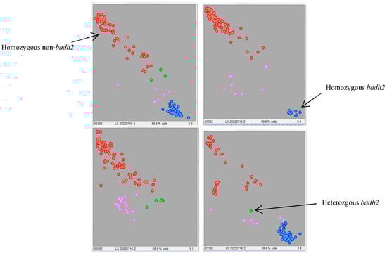 KASP assay of individual plants for the badh2 gene in 384 F7 lines. The blue signal represents the homozygous genotype associated with aromatic traits; the red signal represents the homozygous genotype associated with non-aromatic traits; the green signal represents the heterozygous genotype, which also corresponds to non-aromatic traits; and the pink signal indicates genotypes that could not be determined.