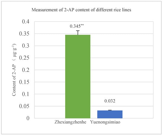 To determine the 2-AP content, mature seeds from Zhexiangzhenhe which possess homozygous badh2 and Yuenongsimiao (non-aromatic) were selected and harvested. After dehusking, the seeds were ground into brown rice flour, and the 2-AP content was measured using a gas chromatography-mass spectrometry (GC-MS) system. The 2-AP content detection results showed that the average content in Zhexiangzhenhe was 0.345 μg·g−1, which was significantly higher than that in Yuenongsimiao, whose average content was only 0.032 μg·g−1 (p < 0.01) (Figure 5).