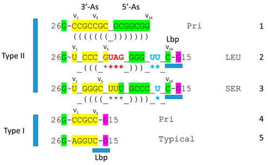 Leucine and serine are in six-codon boxes in the standard genetic code. The type II V arm is utilized as a major determinant for cognate leucine and serine charging of tRNAs. In Archaea, the type II V arm is only utilized by tRNALeu (five tRNALeu) and tRNASer (four tRNASer). In Bacteria, tRNATyr, tRNALeu, and tRNASer utilize type II V arms [2]. In Archaea, almost all tRNALeu V arms are 14 nt in length, which is the primordial length. Ligating a 7 nt 3′-acceptor stem to a 7 nt 5′-acceptor stem generates a 14 nt sequence (initially CCGCCGC_GCGGCGG) (Figure 2, line 1). The type II tRNALeu and tRNASer V arms evolved to form stem–loop–stems utilized as determinants by LeuRS-IA and SerRS-IIA for cognate amino acid charging at tRNA-76A. The type I V loop was processed from the primordial type II V arm sequence (initially CCGCCGC_GCGGCGG processed to CCGCC) (line 4).