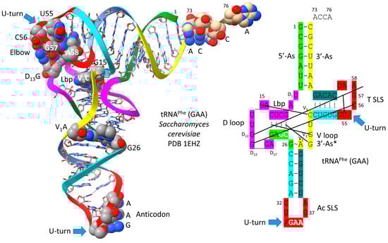 - Shi, H.; Moore, P.B. The crystal structure of yeast phenylalanine tRNA at 1.93 A resolution: A classic structure revisited. RNA 2000, 6, 1091–1105. [Google Scholar] [CrossRef] [PubMed]