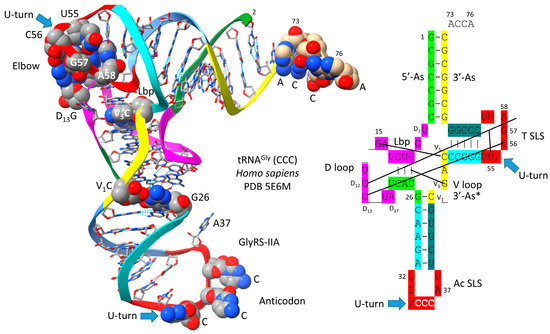 Figure 4 shows a human tRNAGly (CCC) [20]. The image was selected as the best available tRNAGly image with the highest similarity to archaeal tRNAGly. The tRNAGly (CCC) was taken from a co-crystal with GlyRS-IIA. GlyRS-IIA unwinds the anticodon loop to expose 35-CCA-37 as a determinant for cognate tRNAGly (CCC) charging with glycine at 3′-ACCA (at the 3′-O of the ribose ring of 76A). From the primordial sequence, 4 nt was deleted from the 17 nt D loop core, as indicated in the schematic. Also, 1 nt (V2 or V3) was deleted within the type I V loop. V3G forms a triplex interaction with D stem residues D3G and 25U, as indicated in the schematic.