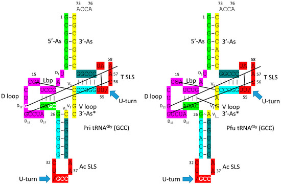 In Figure 1, color coding corresponds to internal tRNA homologies. The 17 nt anticodon and the 17 nt T stem–loop–stems are homologs. Because the complementary sequence of the anticodon stem–loop–stem is almost the same as the forward sequence, the T stem–loop–stem may be derived from the complement of the anticodon stem–loop–stem rather than the direct anticodon stem–loop–stem sequence [1]. The 5′-As* sequence (tRNA-22 to tRNA-26; green) is homologous to tRNA-3 to tRNA-7 of the 5′-As (As for acceptor stem).