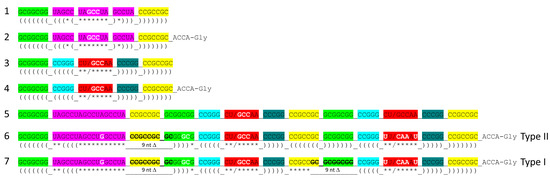 Three ligated anticodon stem–loop–stem 31 nt minihelices are expected to fold and be processed to three 31 nt anticodon stem–loop–stem minihelices, emphasizing the need for the 5′-D loop 31 nt minihelix to generate tRNA (Figure 9; lines 5–7). Colors as in other figures.