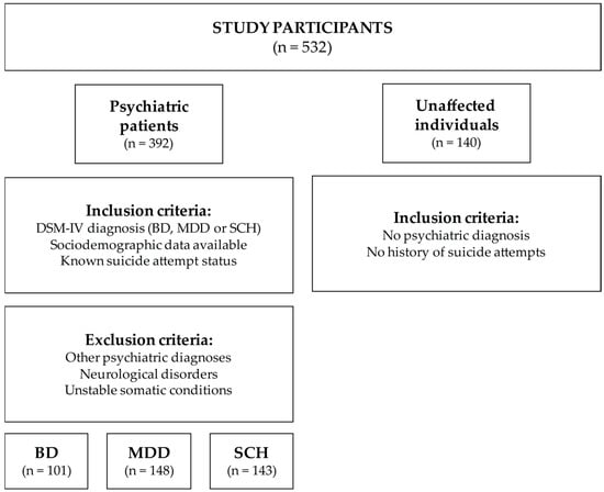 The study included 392 unrelated psychiatric patients diagnosed with BD (n = 101, 25.77%), MDD (n = 148, 37.76%) or SCH (n = 143, 36.48%) using the Structured Clinical Interview for DSM-IV Axis I Disorders [26], described in our previous study [27]. Additionally, 140 unaffected individuals were examined using the same interview. The patients were recruited after five weeks of hospitalization at the Department of Psychiatry, University Clinical Centre of Serbia, between 2006 and 2016. Inclusion criteria were a confirmed DSM-IV diagnosis, sociodemographic data (sex and age), and a history of suicide attempts. Exclusion criteria included the presence of other psychiatric disorders, neurological disorders, or unstable somatic conditions (Figure 1). Patients were categorized according to suicide attempt status. Patients with a history of suicide attempt (SA, n = 175, 44.64%) were hospitalized following an attempt, while the patients without a history of suicide attempt (non-SA, n = 217, 55.36%) were hospitalized due to recurrence of their primary psychiatric disorder and without a history of suicide attempts. All participants provided written informed consent. Ethical approval was obtained from the Ethics Committee of the University Clinical Centre of Serbia (Decision no. 340/4; 21 July 2021). The study was conducted in accordance with the Declaration of Helsinki.