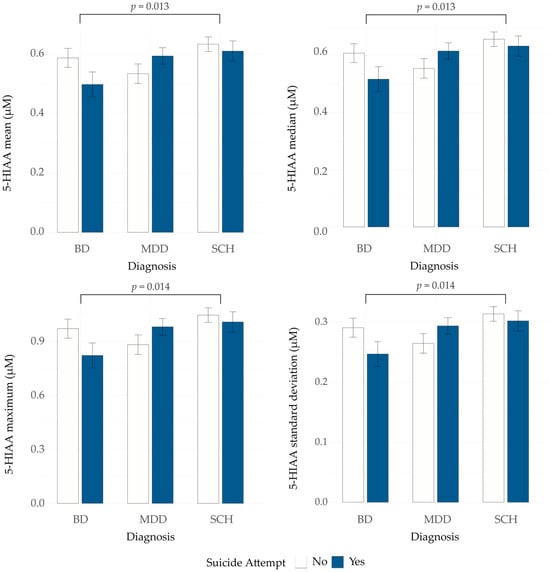 Figure 2. 5-hydroxyindoleacetic acid (5-HIAA) mean, median, maximum and standard deviation in patients with BD, MDD and SCH, with and without a history of suicide attempt. BD—bipolar disorder; MDD—major depressive disorder; SCH—schizophrenia.