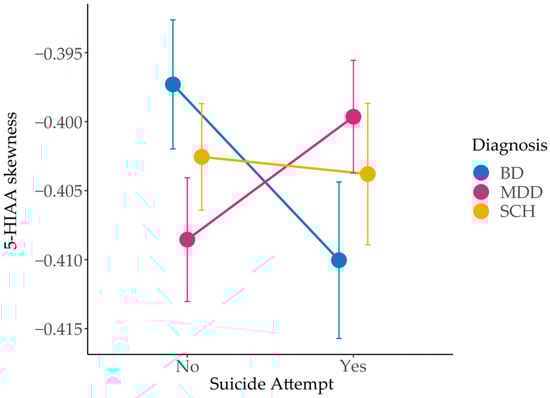 Figure 3. Interaction effect of diagnosis and suicide attempt status on 5-hydroxyindoleacetic acid (5-HIAA) skewness in patients with BD, MDD and SCH, with and without a history of suicide attempt. BD—bipolar disorder; MDD—major depressive disorder; SCH—schizophrenia.