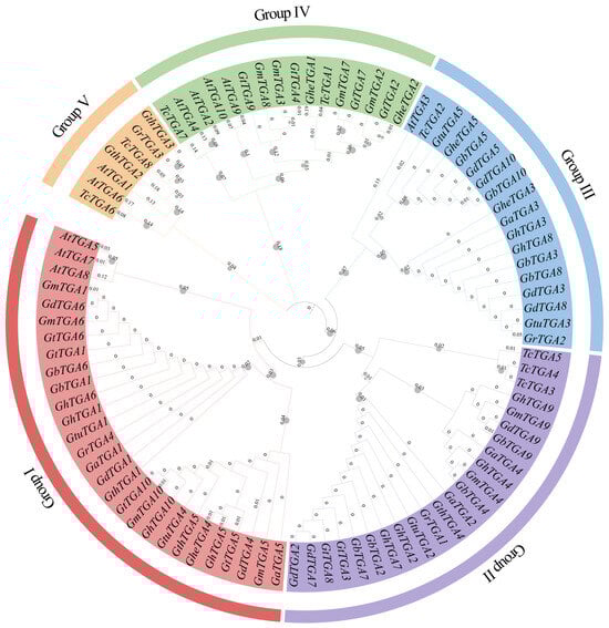 To delineate evolutionary divergence patterns within the TGA transcription factor family, we conducted maximum likelihood phylogenetic reconstruction using protein orthologs from A. thaliana (n = 10), T. cacao (n = 8), and Gossypium species (n = 74), with branch topology detailed in Figure 2. Based on the phylogenetic analysis, the TGA gene family can be categorized into five subfamilies: Group I through Group V. Phylogenetic analysis of Gossypium and T. cacao TGA genes reveals a similar clustering pattern and high sequence homology with A. thaliana. The number of TGA proteins present in cotton remains remarkably stable: diploid cotton species possess five TGA proteins whereas tetraploid species contain approximately ten. This distribution corresponds well with established evolutionary patterns within cotton species. All genes demonstrate one-to-one homology between genomes or subgenomes—indicating that these genes may serve analogous functions across different varieties of Gossypium.