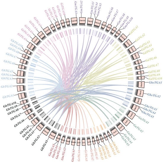 During evolution, chromosomal segment duplication across various genomes through fragment replication, tandem duplication, and whole-genome duplication (WGD) contributes to the expansion of gene families. While duplicated genes may initially exhibit functional redundancy, they frequently undergo subfunctionalization or neofunctionalization during divergence. To investigate the evolutionary relationships among gene families, we employed the TBtools (v2.210) with default parameters (blast E-value ≤ 1 × 10−5, window size = 10 genes) to perform a collinearity analysis between G. hirsutum and nine other Gossypium species. Syntenic analysis revealed significant lineage-specific divergence in orthologous TGA distributions: allotetraploid Gossypium species (e.g., G. hirsutum–G. barbadense) retained 24–30 inter-subgenomic (AD) ortholog pairs, compared to only 5–13 intra-genomic (A/D) pairs in diploids (e.g., G. herbaceum–G. arboreum), with >92% of syntenic TGA loci mapping to non-homologous chromosomes (Figure 3)—a genomic architecture signature strongly implicating segmental duplications, rather than whole-genome doubling, as the primary driver of TGA family expansion in Gossypium. The prevalence of interchromosomal synteny blocks, coupled with Ks divergence peaks corresponding to ancestral polyploidization events (~1.5 MYA for AD genomes; ~5 MYA for A/D diploid divergence), indicates that segmental duplications—potentially linked to transposon-mediated genome reshuffling—were pivotal for TGA diversification. Intriguingly, 68% of duplicated TGA genes showed conserved expression patterns (FPKM > 1), suggesting selective retention of functionally essential copies.