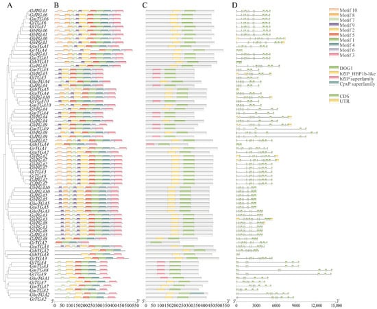 Phylogenetic tree, conserved motifs, conserved domains, and gene structure analysis of TGA proteins from 10 Gossypium species. (A) NJ tree constructed with TGA proteins. (B) Conserved motif analysis of TGA proteins. (C) Analysis of conserved domains of TGA proteins. (D) Analysis of gene structures of TGA.
