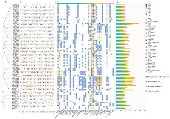 To delineate transcriptional regulatory mechanisms governing Gossypium TGA factors, we performed computational screening of promoter architectures using the PlantCARE database, revealing four phylogenetically conserved cis-regulatory element categories associated with hormonal response and abiotic stress adaptation as shown in Figure 5. Previous studies demonstrate that TGA transcription factors regulate diverse biological processes in plants, including developmental programming, hormonal signaling (jasmonic acid, salicylic acid), and stress adaptation (biotic challenges, abiotic stresses) [20]. Our cis-element annotation categorized conserved motifs into four functional clusters: growth regulation (17 elements, e.g., auxin-responsive elements), light sensing (7 elements, e.g., Box4), stress adaptation (12 elements, e.g., AREs), and hormonal signaling (9 elements, e.g., GARE-motifs) (Figure 5). Notable differences exist regarding both the types and quantities of elements contained within the gene promoters of the Gossypium TGA family members. However, it was observed that members belonging to the same evolutionary branch generally share similar cis-acting elements. All members’ promoters—except for GaTGA5—contain AREs (Antioxidant Response Elements), which are implicated in plant antioxidation processes. Furthermore, nearly all members of the cotton TGA family possess photoresponse-related elements (such as Box4) within their promoters, suggesting that expression of these genes is induced by light exposure. Additionally, most members contain gibberellin response elements (including P-boxes and GARE motifs), indicating their involvement in gibberellin signaling pathways. Moreover, many members’ promoters include JA and SA response elements along with abscisic acid and auxin response elements. This suggests that TGA genes broadly function to regulate cotton growth and development while also playing roles in resisting biotic and abiotic stresses as well as participating in signal transduction processes within Gossypium.