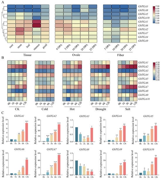 Tissue specific expression and stress-induced expression profile of TGA gene family in G. hirsutum. (A) Tissue-specific expression profile of GhTGAs. (B) Expression profiles of GhTGAs under cold, heat, drought, and salt stress. (C) Differential expression profiles of GhTGA genes under salt stress conditions. The relative expression levels were quantified using the 2−ΔΔCt method with three biological replicates, and normalized to the GhUBQ6 internal control. Data are presented as mean ± standard deviations from three independent replicates. Statistically significant differences are indicated by asterisks (* p < 0.05, ** p < 0.01, *** p < 0.001) in comparison to the respective NaCl treatment at 0 h.