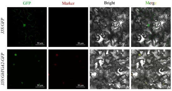 To investigate the expression pattern of the GhTGA2 in cells, we performed transient expression assays using GhTGA2-GFP fusion constructs in Nicotiana benthamiana epidermal cells. As illustrated in Figure 7, the empty vector exhibits green fluorescence both at the cell membrane and within the nucleus of N. benthamiana leaves. In contrast, the GhTGA2 is primarily localized to the nucleus, aligning with predictions regarding its function and subcellular localization as a transcription factor. This finding suggests that the GhTGA2 may play a significant role within the nuclear environment.