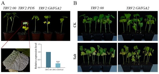 To further investigate the biological function of the GhTGA2 under salt stress in G. hirsutum, we constructed a VIGS vector for GhTGA2 and silenced this gene to induce specific phenotypes in plants, thereby elucidating the role of GhTGA2. The TRV2:GhTGA2 construct was introduced into Agrobacterium tumefaciens strain LBA4404 and subsequently used to infect G. hirsutum. Both TRV2:GhTGA2 and TRV2:GhPDS vectors were transformed into cotton, and the development of cotton leaves was monitored for two weeks post-infection. The results indicated that cotton plants infected with TRV2:GhPDS exhibited albinism in the veins and margins of their leaves by day 7 post-infection; this albinism progressed to encompass the entire leaf by day 14, achieving a silencing efficiency exceeding 85% (Figure 8A). The expression levels of TRV2:00 and TRV2:GhTGA2 were assessed using qRT-PCR, revealing a significant suppression of GhTGA2 gene expression. This finding confirms the successful establishment of a VIGS system targeting cotton. The gene-silenced plants were then cultured for subsequent functional verification experiments.