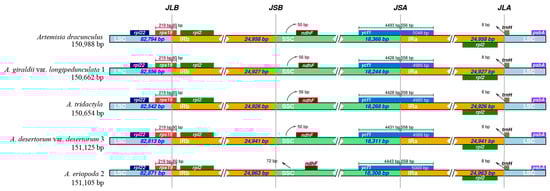 Comparison of the borders of large single-copy (LSC), inverted repeat (IR), and small single-copy (SSC) regions among five Artemisia plastomes. JLB (IRb /LSC), JSB (IRb/SSC), JSA (SSC/IRa), and JLA (IRa/LSC) denote the JSs between each corresponding region in the plastomes.