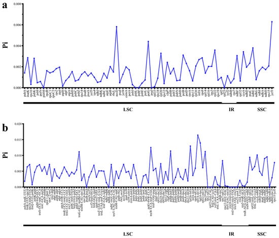 The proportion of parsimony informative sites (Pi) in the 79 Artemisia plastomes. (a). Protein-coding sequences. (b). Intergenic regions. These regions are arranged according to their location in the plastome.