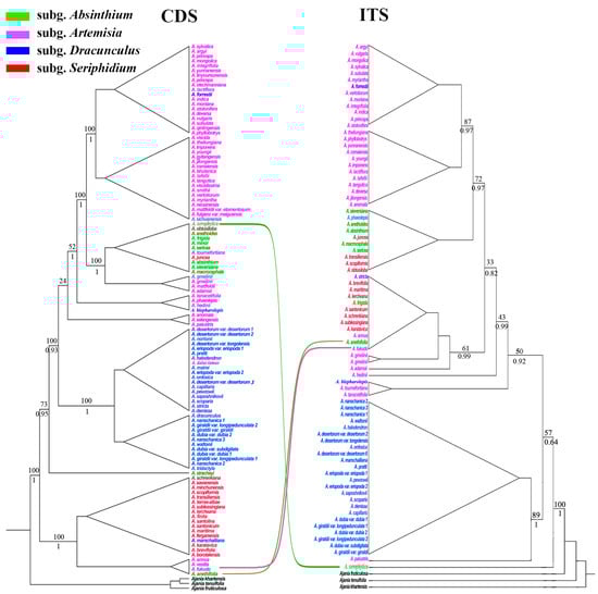 Phylogenetic trees of Artemisia based on the protein-coding sequences (CDS) of plastome and nuclear internal transcribed spacer (ITS) sequences (right) using maximum likelihood (ML) methods. Lines indicate the incongruence between the two trees. The numbers above and under the branches are ML bootstrap value (BS) and BI posterior probabilities (PP).