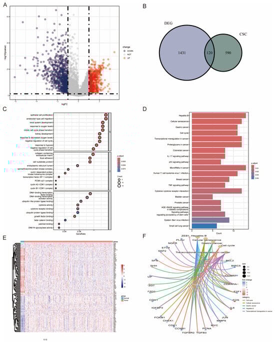 Identification of CSC-Related Genes in the TCGA-BLCA Cohort. (A) Differential gene expression between tumor and normal tissues. (B) Identification of 120 CSC-associated genes overlapping with DEGs in BLCA. (C–F) Functional enrichment analyses of these genes: GO terms (C), KEGG pathways (D), heatmap (E), and top five KEGG pathways (F).