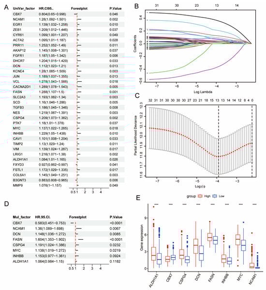 Development of the DE-BCSC Model. (A) Univariable Cox regression analysis identified 34 of the 120 DE-BCSC genes as significant prognostic markers for overall survival (OS) in the TCGA-BLCA cohort. (B,C) LASSO regression analysis further refined these findings, identifying 13 key genes. (B) Each colored line represents the coefficient path of a gene as the regularization parameter (log λ) changes, with only a subset retaining non-zero coefficients. (C) The red dots indicate the mean partial likelihood deviance for each log λ value, while the gray error bars represent the corresponding standard errors. (D) Random Forest analysis narrowed this down to 8 DE-CSCs, which were identified as critical prognostic indicators. (E) Expression levels of these 8 diagnostic genes were compared between high-risk and low-risk groups within the TCGA-BLCA dataset. Significance levels are indicated as * p < 0.05, ** p < 0.01, and *** p < 0.001.
