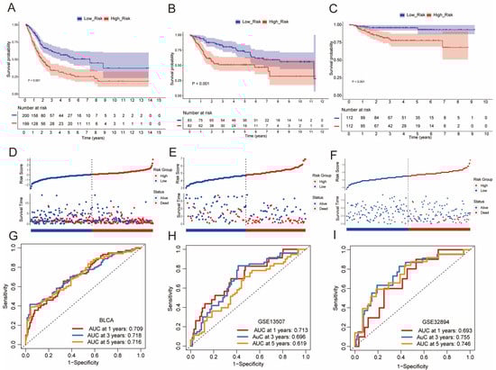 Kaplan–Meier analysis assessed the relationship between the BCSC signature and OS in BLCA. The survival curves showed that patients in the high-risk group had significantly worse overall survival compared to those in the low-risk group (Figure 3A). To validate the prognostic capability of the BCSC signature, risk scores were calculated for patients in the GSE13507 and GSE32894 cohorts (Figure 3B,C). Risk score curves and scatter plots further supported the signature’s effectiveness in distinguishing between risk groups (Figure 3D–F). Time-dependent ROC curves demonstrated the CSC model’s accuracy, with stable AUC values confirming its reliability in predicting survival outcomes at different time points (Figure 3G–I).