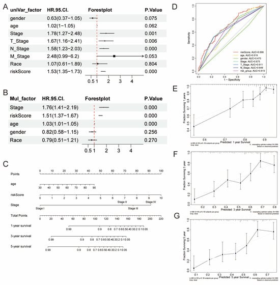 To further validate clinical variables, we evaluated factors such as age, gender, cancer stage, T stage, N stage, M stage, race, and risk score using univariate and multivariate Cox regression analyses. Univariate analyses identified cancer stage, T stage, N stage, and risk score as significantly associated with OS (p < 0.05) (Figure 4A). The multivariate analysis further confirmed that age, cancer stage, and risk score were independent predictors of OS (p < 0.05) (Figure 4B). Notably, the risk score showed superior predictive accuracy compared to other clinical variables, with an AUC of 0.696 in the ROC curve (Figure 4D). A nomogram was then constructed using age, stage and risk score to predict 1-, 3-, and 5-year OS (Figure 4C). Calibration curves confirmed the nomogram’s accuracy, showing strong agreement between predicted and actual OS outcomes (Figure 4E–G).