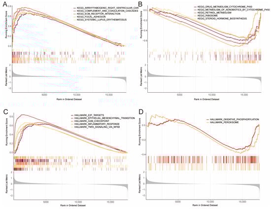 GSEA of High- and Low-Risk Group Samples. (A,B) Gene Set Enrichment Analysis (GSEA) highlights enriched gene sets from the C2 collection, showing the top five KEGG pathways for up-regulated (A) and down-regulated (B) genes. (C,D) Analysis of HALLMARK gene sets reveals the top five enriched pathways for up-regulated genes (C) and the top two pathways for down-regulated genes (D).