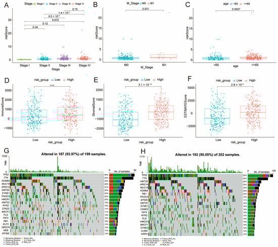 Risk Score and Clinical Correlation Analysis. (A–C) Comparative analysis of risk scores across cancer stages, M stages, and age groups, respectively. (D–F) Evaluation of immune-related scores between high- and low-risk groups, highlighting variations in immune profiles within these classifications. (G,H) Oncoprint visualizations for the low-risk group (G) and high-risk group (H), illustrating the genetic landscape and mutation patterns in each group.