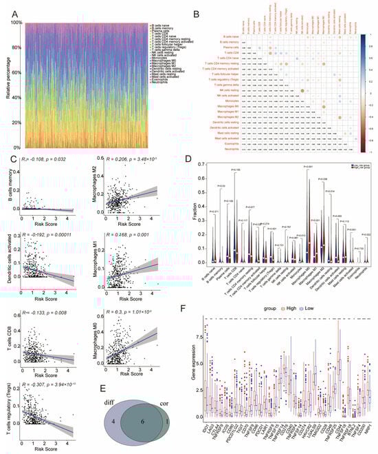 Immune-Related Analysis. (A) Comprehensive assessment of immune cell populations in tumor samples. (B) Correlation analysis between different immune cell types. (C) Regression analysis between immune cell populations and the risk score; black dots represent individual samples, the blue line indicates the fitted regression line, and the gray area shows the 95% confidence interval. (D) Comparison of immune cell distributions between high- and low-risk groups. (E) Overlap analysis of immune cells that are both differentially expressed and correlated with risk. (F) Variations in immune-related genomic features between high- and low-risk groups.