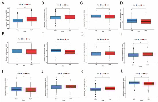 Comparison of chemotherapy drug sensitivity between low- and high-risk subgroups. The oncoPredict algorithm predicted the IC50 values of Acetalax (A), Afuresertib (B), Alisertib (C), Bortezomib (D), Cisplatin (E), Dasatinib (F), Mitoxantrone (G), Oxaliplatin (H), Paclitaxel (I), Palbociclib (J), Sorafenib (K), and Talazoparib (L) in the two subgroups. Significance levels are indicated as * p < 0.05, ** p < 0.01, *** p < 0.001, and **** p < 0.0001.