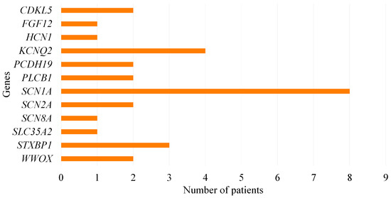 Pathogenic and likely pathogenic variants were identified in 29 of the 129 patients, resulting in a diagnostic yield of 22.48%. Pathogenic and likely pathogenic variants were detected in SCN1A (n = 8), KCNQ2 (n = 4), STXBP1 (n = 3), CDKL5 (n = 2), PCDH19 (n = 2), PLCB1 (n = 2), WWOX (n = 2), SCN2A (n = 2), FGF12 (n = 1), HCN1 (n = 1), SCN8A (n = 1), SLC35A2 (n = 1) genes (Figure 1). Among these genes, 12 novel variants were found in 7 genes: CDKL5, HCN1, SCN1A, SCN2A, SCN8A, SLC35A2, and STXBP1. SCN1A was the most frequently affected gene in the pathogenic/likely pathogenic variants group and was detected in 7 patients with DS. The variant types included 4 missense, 1 nonsense, 1 splice-region, and 1 stop-gained. The genes affected in patients with WS were WWOX, SLC35A2, SCN2A, and SCN1A. In the EIDEE patients, KCNQ2 was the most commonly affected gene, followed by STXBP1, CDKL5, FGF12, SCN2A, and WWOX. PCDH19, PLCB1, SCN8A, and HCN1 variations were found in Late Infantile Developmental and Epileptic Encephalopathy (LIDEE) patients.