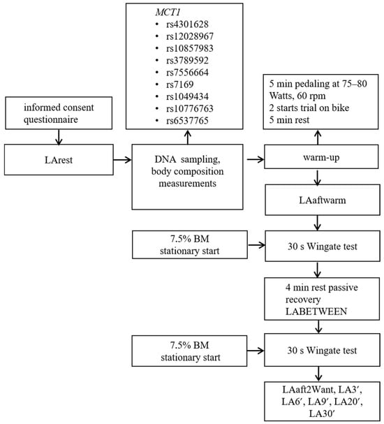 Flow chart of formal procedures, DNA sampling, anaerobic loading, and timing of blood LA samples. LArest—LA at rest, BM—body mass, LAaftwarm—LA following the warm-up, LABETWEEN-LA during the third minute of rest after the first Wingate test but before the second, LAaft2Want—LA immediately after the second Wingate; LA3’—LA at 3’ min post-second Wingate; LA6’—LA at 6’ min post-second Wingate, LA9’—LA at 9’ min post-second Wingate, LA20’—LA at 20’ min post-second Wingate; LA30’—LA at 30’ min after the second Wingate test; MAX LA—maximum LA concentration.