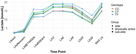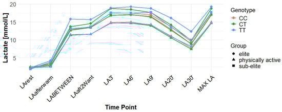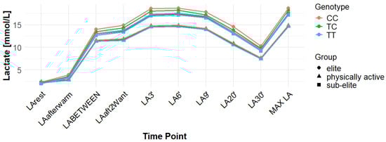 The rs10776763 polymorphism was significantly associated with ACC in the elite athlete subgroup under the recessive model (p = 0.01; FDR-adjusted p = 0.03). According to this model, TT + TC showed lower ACC than CC (15.82 and 17.08 vs. 17.67 mmol/L). In elite athletes, mean ACC values were 17.67 mmol/L for CC, 17.08 mmol/L for TC, and 15.82 mmol/L for TT genotypes. This result remained statistically significant after FDR correction. No significant associations were observed in other groups under this model (p = 0.69, 0.67, and 0.37 for all, physically active, and sub-elite, respectively) (Table 3). Figure 2, Figure 3, Figure 4, Figure 5, Figure 6, Figure 7, Figure 8, Figure 9 and Figure 10 illustrate the changes in LA concentrations over time, differentiated by genotype and training groups. The visualized time course includes both resting concentrations (LArest) and MAX LA, which together constitute the components used to calculate ACC.