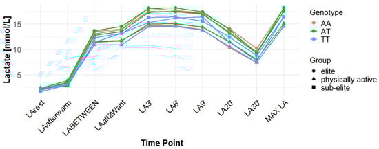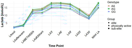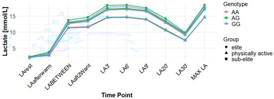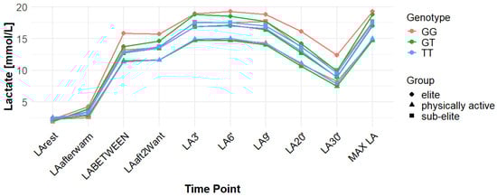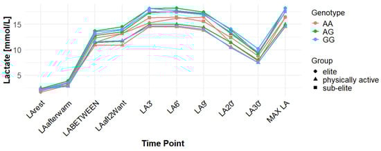 Associations with delta clearance capacity (DCC), defined as the difference between maximal post-exercise LA concentration and LA concentration measured 30 min after the second Wingate test (LA30’), were initially observed for several SNPs. However, only some remained significant after FDR adjustment. The rs12028967 polymorphism was associated with DCC in the overall cohort under both the codominant and recessive models (p = 0.02 for both and FDR-adjusted p = 0.03 for both). In the overall group, individuals with the GT genotype exhibited the highest mean DCC value (8.14 mmol/L), whereas GG homozygotes had the lowest (7.26 mmol/L), and TT carriers had an intermediate value (8.07 mmol/L). In the elite athlete subgroup, however, the TT genotype showed the highest DCC (9.51 mmol/L), while the GG genotype again had the lowest (7.03 mmol/L). These associations in the overall cohort remained significant after FDR correction. Associations were noted for rs3789592 in elite athletes across all models (codominant, dominant, and recessive: p = 0.04; FDR-adjusted p = 0.04). In the codominant model, AA carriers showed the highest DCC (10.99 mmol/L), compared to AG (9.30 mmol/L) and GG (8.17 mmol/L). In the dominant model, GG showed lower DCC (8.17 mmol/L) than AG and AA (9.30 and 10.99 mmol/L, respectively). In the recessive model, GG and AG showed lower DCC (8.17 and 9.30 mmol/L) compared with AA (10.99 mmol/L). These associations remained statistically significant after FDR correction. In sub-elite athletes, an association was observed under the recessive model (p = 0.03; FDR-adjusted p = 0.09). GG and AG showed higher DCC (8.34 and 8.85 mmol/L) than AA (7.29 mmol/L). However, this association did not remain significant after FDR adjustment. The results for rs7556664 demonstrated similarities to those of rs3789592, indicating a comparable pattern between the two. In sub-elite athletes, the recessive model showed an association (p = 0.03; FDR-adjusted p = 0.09), with AA and AT showing higher DCC (8.34 and 8.85 mmol/L) than TT (7.29 mmol/L). However, this association did not remain statistically significant after FDR correction. In elite athletes, significant associations were detected across all models (codominant, dominant, and recessive: p = 0.04; FDR-adjusted p = 0.04). In the codominant model, mean DCC values were 8.17 mmol/L for AA, 9.30 mmol/L for AT, and 10.99 mmol/L for TT. In the dominant model, AA showed lower DCC than (AT + TT) and in the recessive model, (AA + AT) showed lower DCC than TT (8.17 and 9.30 vs. 10.99 mmol/L). All of these associations remained statistically significant after FDR correction. A similar pattern was observed for rs7169. Significant associations were observed in elite athletes across all models (codominant, dominant, and recessive: p = 0.04; FDR-adjusted p = 0.04). Mean DCC values were 8.17 mmol/L for AA, 9.30 mmol/L for AG, and 10.99 mmol/L for GG. In the codominant model, AA showed lower values (8.17 mmol/L) compared with AG (9.30 mmol/L) and GG (10.99 mmol/L). In the dominant model, AA showed lower DCC than AG and GG. In the recessive model, AA and AG showed lower DCC (8.17 and 9.30 mmol/L) than GG (10.99 mmol/L). All of these associations remained statistically significant after FDR correction. In sub-elite athletes, an association was observed under the recessive model (p = 0.03; FDR-adjusted p = 0.09), with AA and AG showing higher mean DCC (8.34 and 8.85 mmol/L) than GG (7.29 mmol/L). However, this association did not remain statistically significant after FDR correction. For rs1049434, significant associations emerged in the recessive model for the general population (p = 0.03; FDR-adjusted p = 0.09) and sub-elite (p = 0.03; FDR-adjusted p = 0.09). In both cases, TT + AT carriers showed higher DCC compared with AA (all: 7.94 and 8.15 vs. 7.74 mmol/L; sub-elite: 8.34 and 8.85 vs. 7.29 mmol/L). However, these associations did not remain statistically significant after FDR correction. In elite athletes, significant associations were detected across all models (codominant, dominant, and recessive (p = 0.04; FDR-adjusted p = 0.04 for all). Mean DCC values were 8.17 mmol/L for TT, 9.30 mmol/L for AT, and 10.99 mmol/L for AA, and all of these associations remained significant after FDR correction. The rs10776763 polymorphism showed associations under the codominant model in elite athletes (p = 0.03; FDR-adjusted p = 0.09) and the recessive model in the general population (p = 0.03; FDR-adjusted p = 0.09). However, neither association remained statistically significant after FDR correction. Lastly, the rs6537765 SNP showed an association in the recessive model for the general population (p = 0.03; FDR-adjusted p = 0.09), but this association lost statistical significance due to FDR adjustment. In elite athletes, significant associations were detected across all models (codominant, dominant, and recessive: p = 0.04; FDR-adjusted p = 0.04). In the codominant model, the AA genotype showed a higher DCC (10.99 mmol/L) than the AG (9.28 mmol/L) and GG (8.14 mmol/L) genotypes. In the dominant model, GG showed lower DCC (8.14 mmol/L) than AG (9.28 mmol/L) and AA (10.99 mmol/L). In the recessive model, AG and GG showed lower DCC (9.28 and 8.14 mmol/L) than AA (10.99 mmol/L). All of these associations in elite athletes remained statistically significant after FDR correction (Table 4). Figure 2, Figure 3, Figure 4, Figure 5, Figure 6, Figure 7, Figure 8, Figure 9 and Figure 10 illustrate the changes in LA concentrations over time, differentiated by genotype and training groups. The visualized time course includes both the MAX LA and LA30’, which together constitute the components used to calculate delta clearance capacity (DCC).
