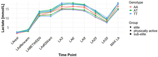 Time course of lactate (LA) concentrations across genotypes for MCT1 (monocarboxylate transporter 1) rs1049434 polymorphism. The data are presented as the mean for each time point. LArest—LA concentration before the warm-up at rest; LAaftwarm—LA after warm-up; LABETWEEN—LA in the third minute of rest after the first but before the second Wingate test; LAaft2Want—LA immediately after the second Wingate test; LA3’—LA at 3 min post-second Wingate; LA6’—LA at 6 min post-second Wingate. LA9’—LA at 9 min post-second Wingate. LA20’—LA at 20 min post-second Wingate; LA30’—LA at 30 min after the second Wingate test; MAX LA—maximum LA concentration; AA—homozygote for the minor allele (A); AT—heterozygote; TT—homozygote for the major allele (T).
