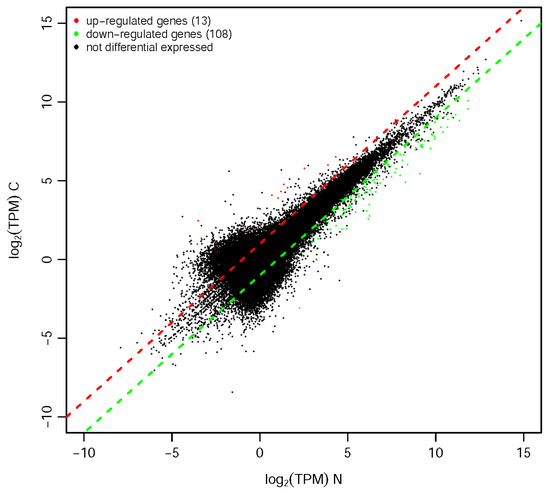 Scatter plot of expression differences between comparison groups. The x- and y-axes represent the log2(TPM) values of the two sample groups. Each point corresponds to a gene, with points closer to the origin indicating lower expression levels. Red points denote upregulated genes, green points represent downregulated genes, and black points indicate non-differentially expressed genes. Red/green dots denote DEGs (FDR < 0.05, |log2FC| > 1); dashed lines indicate significance thresholds. Upregulation/downregulation is defined as the log2(TPM) ratio of the y-axis group relative to the x-axis group. “C” indicates winged morph, while “N” denotes wingless morph.