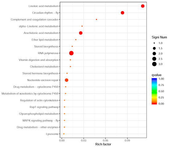 KEGG analysis (q-value < 0.05) revealed significant enrichment in lipid metabolism pathways (e.g., linoleic acid and arachidonic acid metabolism) and circadian rhythm pathways (Figure 4 and Figure 5). These pathways are critical for energy allocation and environmental adaptation. Other enriched pathways included nucleotide excision repair and immune-related processes, reflecting trade-offs between dispersal and reproduction.