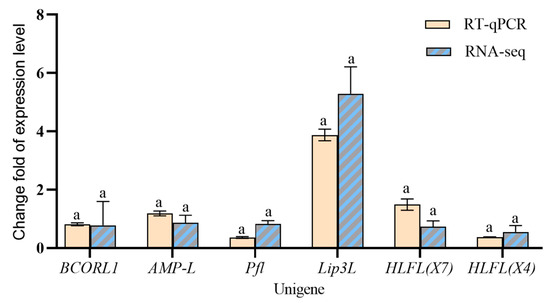 To confirm the reliability of transcriptome sequencing data, six differentially expressed genes (DEGs) exhibiting significant expression variations (|log2FC| > 2, p < 0.01) were randomly selected for experimental validation. The housekeeping gene β-actin (GenBank accession: MF083568) was used as an internal control. Six DEGs were selected based on KEGG pathway dominance: two lipid metabolism (Lip3L, PLB1L), two circadian rhythm (HLFLs), one reproduction (Pfl), and one stress response (BCORL1). Primer sequences are listed in Table 1.