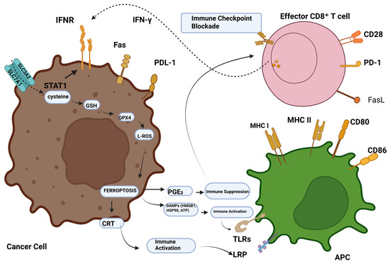 Ferroptosis-tumour immunity modulation. CD8+ T cells stimulated by immunotherapy emit IFN-γ, activating INFR. INFR suppresses STAT1-mediated SLC7A11 transcription. This downregulation of system Xc- causes ROS-mediated ferroptosis via GSH-GPX4. Ferroptotic cells generate DAMPs like HMGB1, CRT, and AA, which recruit and activate immune cells. Conversely, elevated PGE2 helps tumour immune evasion. Abbreviations: IFN-γ, INFR, SLC7A11, SLC3A2, STAT1, ROS, GSH, GPX4, DAMPs, HMGB1, calreticulin, AA, PGE2, and PGE2 [14]. Reproduced via Biorender from Ref. [14] with permission under a Creative Commons Attribution License (CC-BY), copyright the authors.