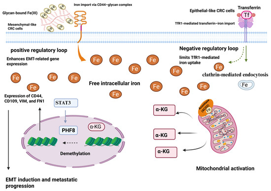 CD44 plays a role in the uptake of iron during EMT in colorectal cancer cells. TF-TfR1 is the mechanism by which epithelial phenotype colorectal cancer cells import iron. Intracellular iron and TfR1 form a negative feedback loop that limits the TF-TfR1 pathway, meaning that mesenchymal phenotype CRC cells require more iron. The absorption of iron by CRC cells through a glycan-Fe (III)-CD44-mediated process can enhance mitochondrial function and the generation of α-ketoglutaric acid (α-KG). The activity of the plant homeodomain finger protein 8 demethylase is enhanced by an increase in α-KG in conjunction with ferrous iron. In the end, this leads to the expression of genes related to EMT, such as CD44 [20]. Reproduced via Biorender from Ref. [20] with permission under a Creative Commons Attribution License (CC-BY), copyright the authors.
