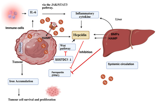 Regulation of cancer hepcidin production. Hepcidin is produced by the liver and malignant tumour cells. Hepcidin overexpression in tumour tissue is linked to BMP molecules, such as BMP7, and inflammatory triggers, including interleukin-6. In cancer tissue, the Wnt pathway and the sclerostin domain-containing protein 1 (SOSTDC1), which is downregulated due to epigenetic silencing, have been found to regulate hepcidin. Ferroportin sequesters iron in tumour cells when hepcidin levels rise in the tumour microenvironment. Hepcidin increases with TFR1 overexpression, which enhances tumour cell iron availability. Increasing iron stores helps tumour cells survive and grow [97]. Reproduced via Biorender from Ref. [97] with permission under a Creative Commons Attribution License (CC-BY), copyright the authors.