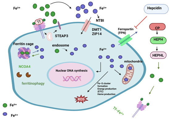Cellular iron metabolism. Iron levels are closely managed since too little or too much can harm cells. Iron intake, use, storage, and export must be synchronised, as must the cell’s conversion between Fe2+ and Fe3+ oxidation states. Iron importers DMT1 and ZIP14 take up TF-Fe3+ and NTBI into the cell. STEAP3, a ferrireductase, converts Fe3+ to Fe2+ for import. Once inside the cell, bioavailable and more soluble Fe2+ is used for DNA replication, ROS production via Fenton/Haber-Weiss (F/H-W) chemistry, mitochondrial bioenergetics, Fe-S and heme biosynthesis, and by many proteins. Due to ROS generation, excess Fe2+ iron is harmful. Thus, it must be stored but accessible. Ferritin proteins create the “ferritin cage” to store the insoluble Fe3+ form of iron. NCOA4 destroys this ferritin cage to release iron when intracellular levels are low. aturated intracellular iron levels require iron export. Ferroportin (FPN) exports iron. Fe2+ iron is oxidised to Fe3+ outside the cell by CP, HEPH, HEPHL. After binding to transferrin (Tf-Fe3+), Fe3+ iron enters circulation to restart the cycle. Hepcidin, a liver hormone, regulates iron metabolism. Hepcidin degrades FPN in cells to prevent iron release into the blood when systemic iron levels are high. Alternatively, low iron blood levels limit hepcidin expression [108]. Reproduced via Biorender from Ref. [108] with permission under a Creative Commons Attribution License (CC-BY), copyright the authors.