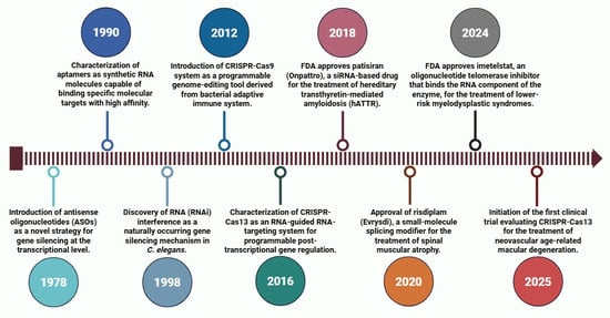 Key milestones in the development and application of RNA-targeting approaches. This figure summarizes major scientific and clinical milestones in the advancement of RNA-targeting technologies, spanning from the introduction of antisense oligonucleotides (ASOs) in 1978 to the initiation of the first clinical trial involving CRISPR-Cas13 in 2025. It presents significant discoveries in RNA biology and key regulatory approvals that underscore the growing potential of RNA-targeting strategies in cancer therapy.