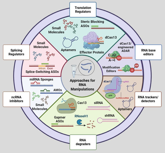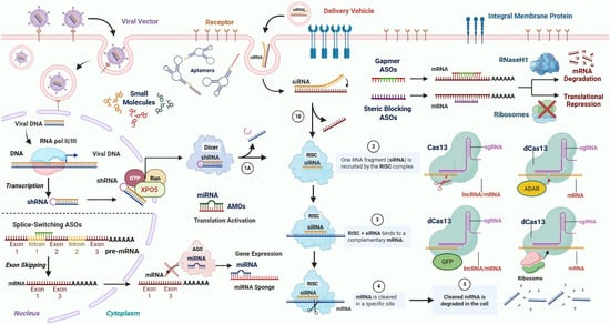 Several distinct RNA-targeting strategies have been developed, each exploiting unique molecular mechanisms to achieve post-transcriptional modulation. Among the most well-established are antisense oligonucleotides (ASOs) and RNA interference (RNAi), which utilize sequence complementarity to inhibit translation, affect splicing, or induce transcript degradation [47,48,49]. These approaches have already been translated into clinical settings and are used in FDA-approved therapies for genetic and neurological disorders. More recent innovations include CRISPR-Cas13 systems, which enable programmable RNA cleavage and editing, offering high specificity and modularity for both research and therapeutic applications [41,50]. Additionally, small molecules that bind structured RNA motifs have emerged as a strategy to alter RNA stability or function, especially for ncRNAs or pathogenic repeat expansions [51].