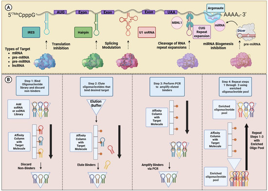 Small molecules and aptamers as tools for RNA targeting. (A) Schematic representation of the primary mechanisms by which small molecules target RNA. These compounds can modulate pre-mRNA splicing by inhibiting or stabilizing interactions with the splicing machinery, inhibit translation by binding to internal ribosome entry sites (IRES) and blocking ribosome binding, correct structural abnormalities (like expansions of CUG repeats) in mRNAs, and interfere with pre-miRNA disrupting its biogenesis. (B) Overview of the Systematic Evolution of Ligands by EXponential enrichment (SELEX) process, illustrating the iterative selection of aptamers with high affinity and specificity for a given RNA target.