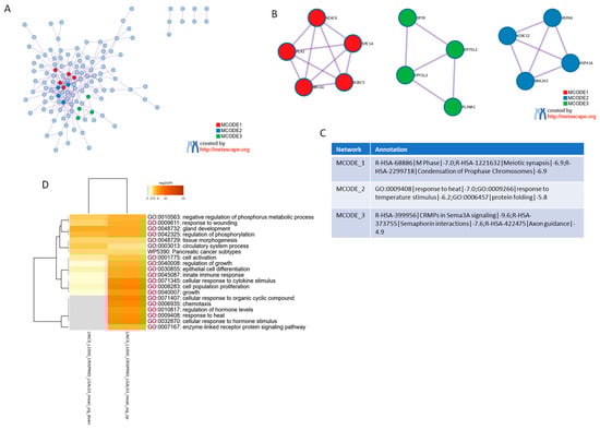 Functional enrichment analysis of the consensus gene signature following LGALS3 CRISPR deletion. (A) Protein–Protein Interaction network of genes consistently deregulated across multiple cancer cell lines upon LGALS3 knockout, conducted using the Metascape platform (accessed on 3 June 2025). Each MCODE network is assigned a unique color. (B) Network visualization of MCODE clusters, representing densely connected functional modules. (C) Summary table of major functional clusters enriched in the consensus gene signature, highlighting representative biological processes and pathways associated with LGALS3 loss. (D) Gene Ontology (GO) and pathway enrichment analysis of the consensus signature derived from CRISPR/Cas9-mediated knockout of LGALS3 is presented as heatmap. The heatmap cells are colored by their p-values and significant terms are hierarchically clustered based on their statistical similarities.