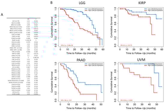 Prognostic significance of LGALS3 expression across human cancers. (A) Hazard ratios (HRs) and corresponding p-values for overall survival (OS) at 60 month follow-up across TCGA tumor types, stratified by LGALS3 expression and adjusted for tumor stage and purity using multivariate Cox regression. (B) Kaplan–Meier survival curves illustrating significantly reduced OS in patients with high LGALS3 expression for selected cancer types where p < 0.05.