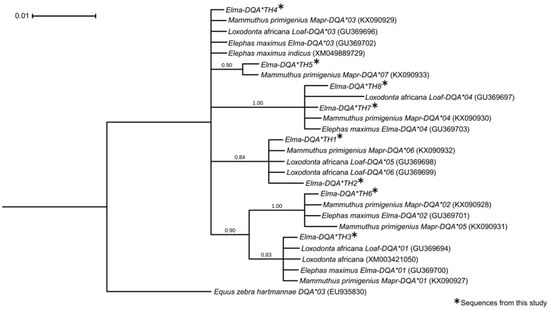 Bayesian phylogenetic tree of partial exon 2 of the DQA gene alleles for captive Thai elephants. The values above the branches represent posterior probability. Scale shows substitutions per site.